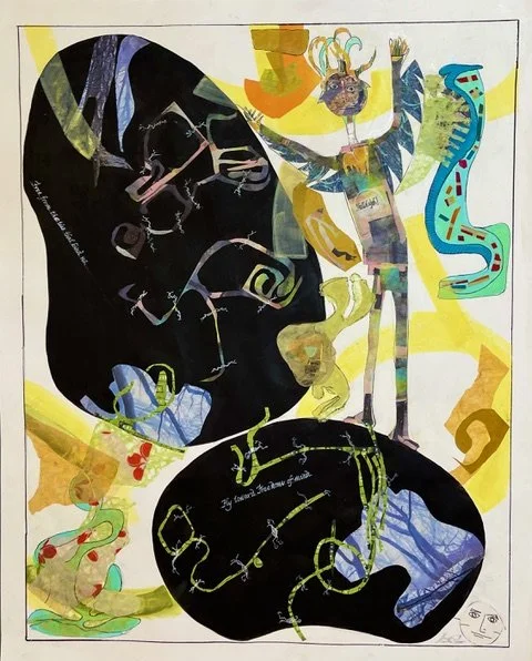 Mixed Medium: Painted paper collage, with mulberry paper overlays, and paint pen drawing.